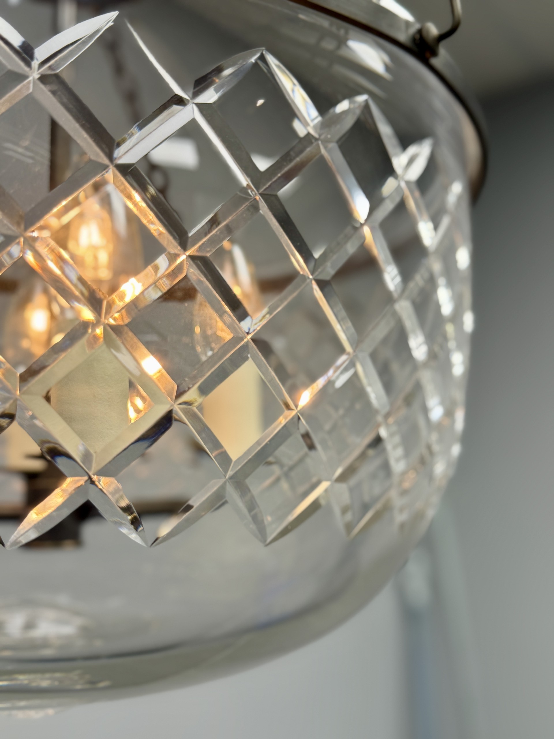 Hand blown lead crystal bowl with a moulded central knop finial. Hand cut and polished in a large diamond pattern. Dark bronze metal work